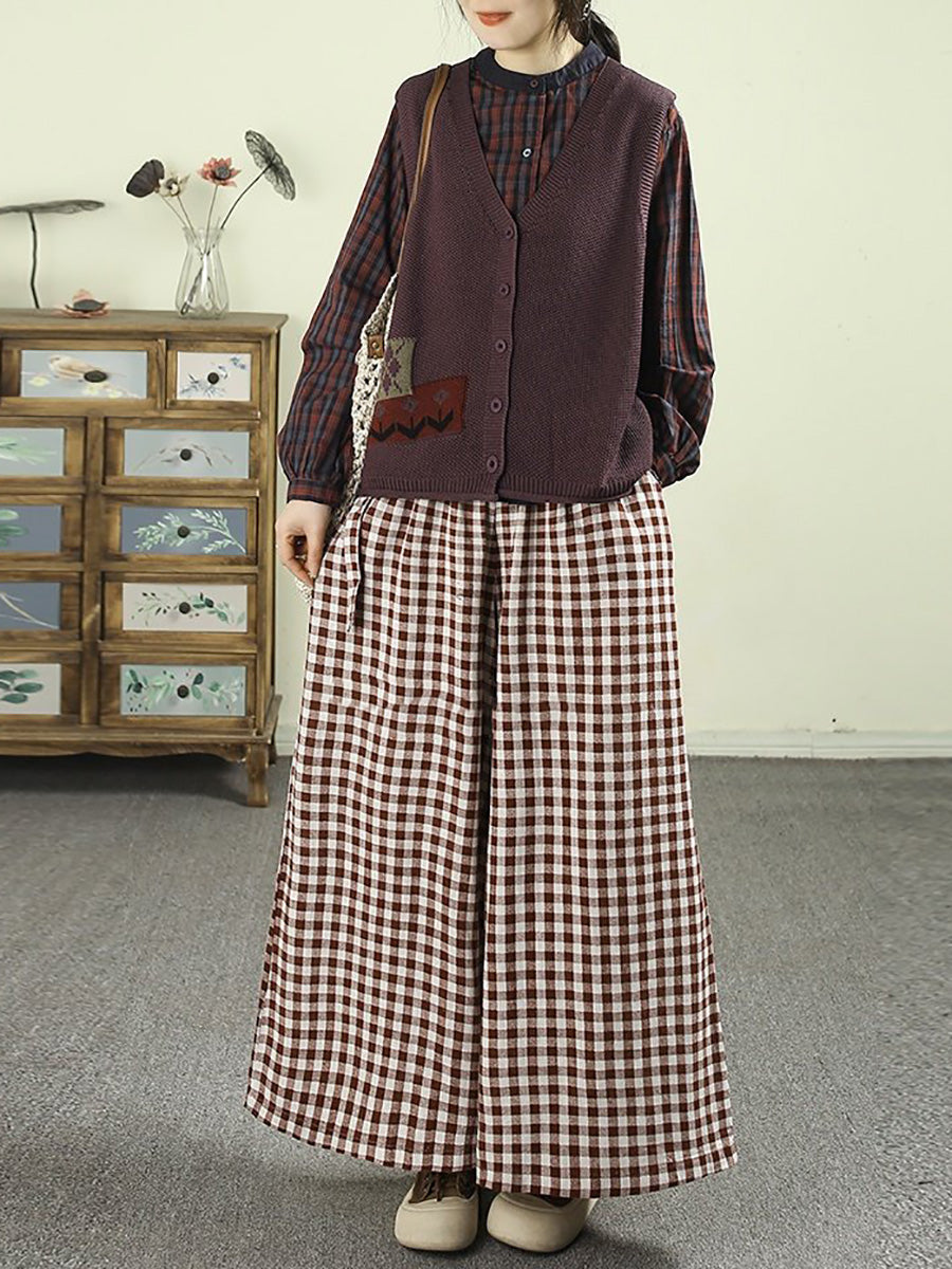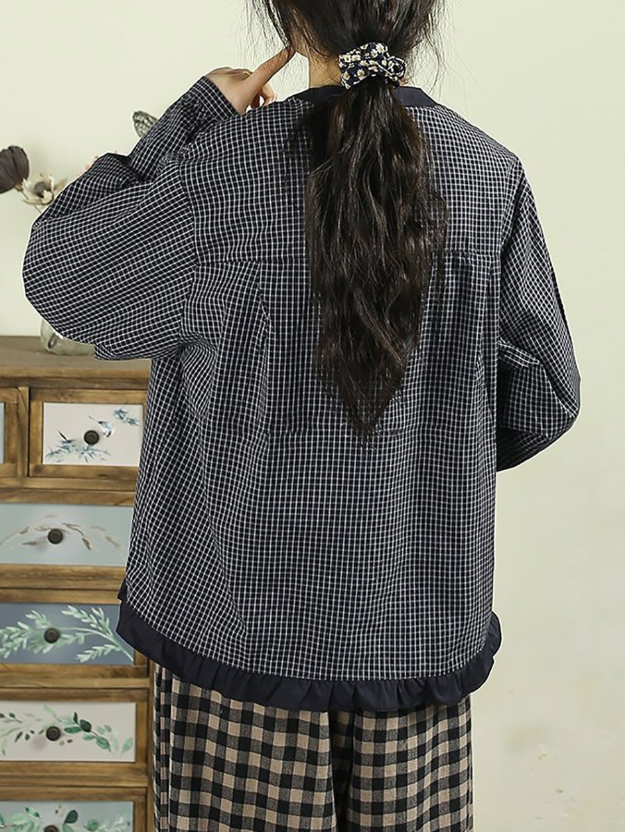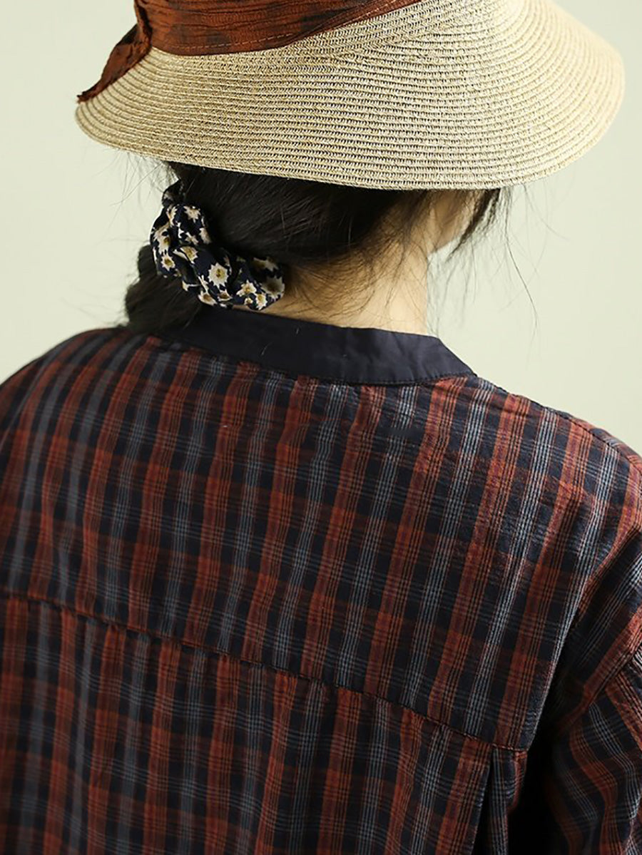 女士春季復古格紋100%純棉立領襯衫