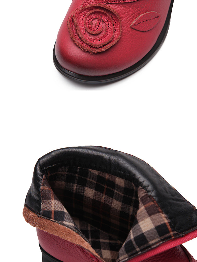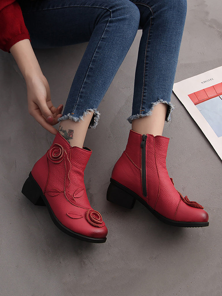 女復古花朵皮革純色中跟靴子